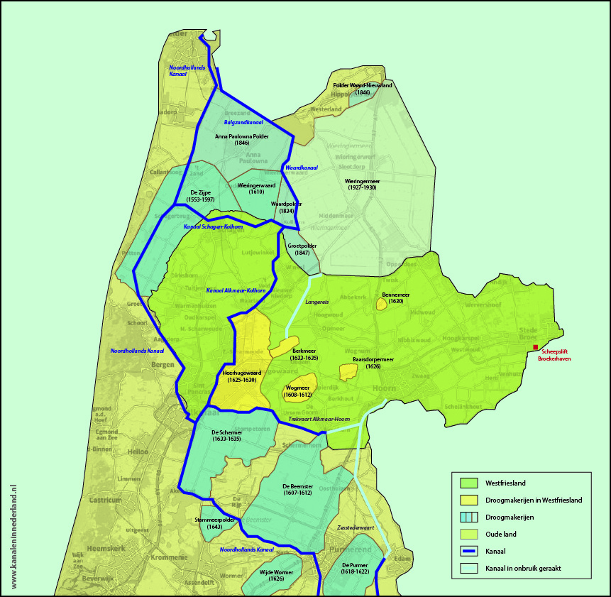 West-Friesland als eiland tussen de droogmakerijen. Wie in de Kop van Noord-Holland ronddwaalt kan zich verbazen over de tientallen dijken en variaties in poldergezichten. Deze kaart geeft inzicht hoe dat is ontstaan en hoe de kanaalbouwers daar gebruik van hebben gemaakt.